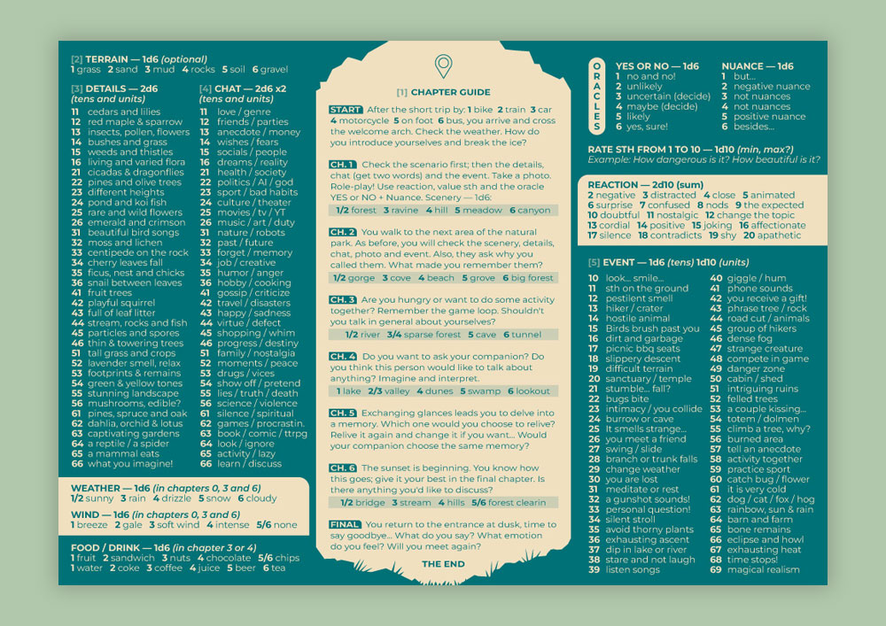 Daydream Pics is a Solo RPG that invites you to imagine a walk through a ficticious natural park in the company of someone special you haven't seen in a while (friend, family member, ex-partner, crush...). Explore that day of hiking at your current age, when you are younger, or even many years from now.